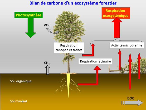 • La fixation du carbone dans les forêts se fait par un seul mécanisme : la photosynthèse, alors que les pertes de carbone des forêts se réalisent par des voies très diverses.
